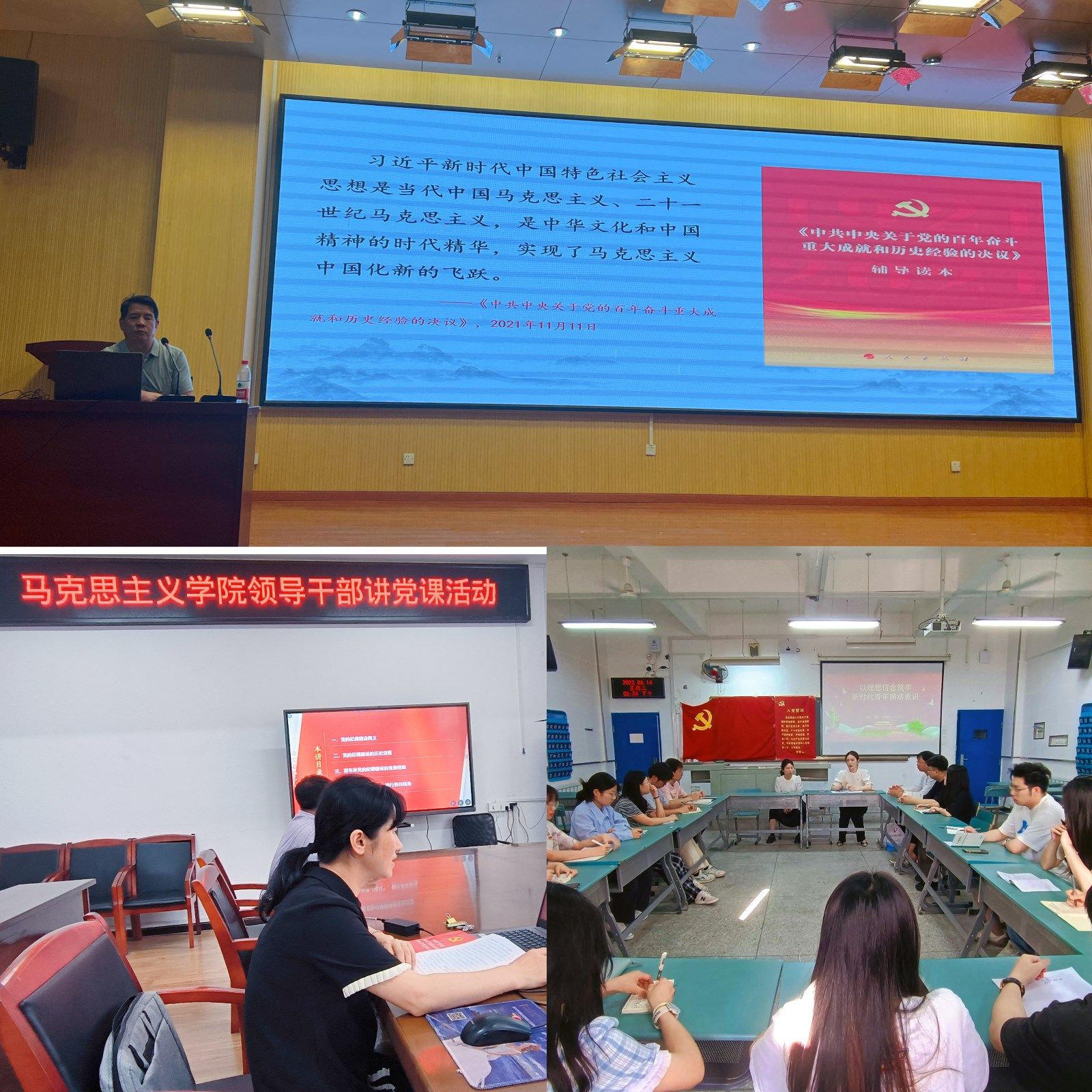 学院领导班子成员专题党课结合主题教育要求,分党委书记计毅波以“马克思主义中国化新的飞跃——深入开展学习贯彻习近平新时代中国特色社会主义思想”为主题、院长黄永昌以“凝心聚力打造共同缔造十堰样本——如何向基层干部群众讲好共同缔造”为主题、副院长成继续平以“全面加强党的纪律建设 扛牢全面从严治党使命担当”为主题、副院长安军以“坚定不移推进全面从严治党,完善党的自我革命制度规范体系”为主题、副书记李童以“以理想信念筑牢新时代青年廉洁意识”为主题,面向学院全体教师、理论学习中心组成员、教师党员、学生党员以及入党积极分子等,对习近平新时代中国特色社会主义思想的基本观点、马克思主义中国化新的飞跃、全面从严治党等方面进行了深入阐释和解读,让学院师生接受了一次心灵的净化和精神的洗礼,进一步坚定了理想信念,深化了党性教育。